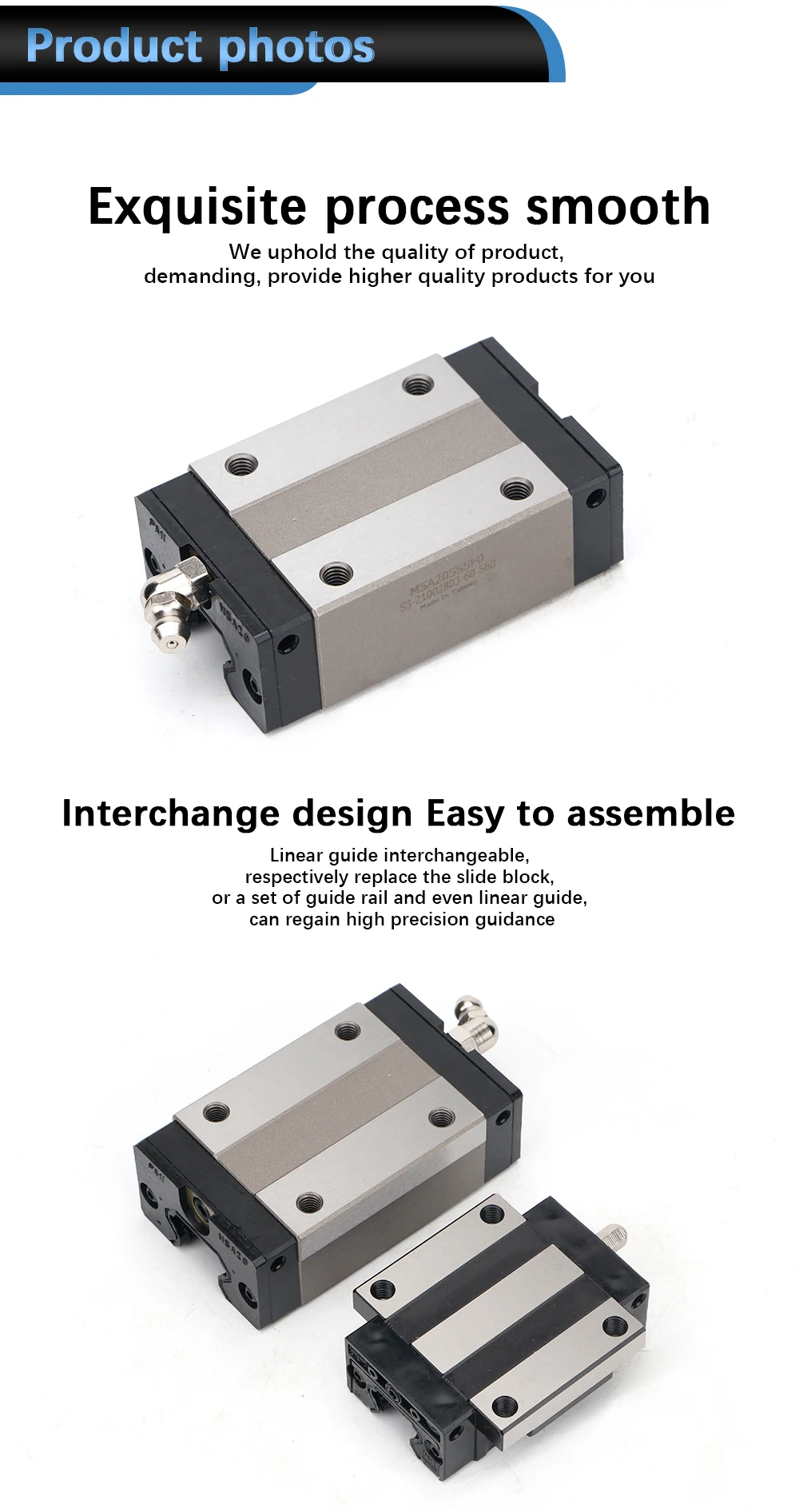 Guide Slide block features Heavy load, high rigidity, automatic aligning ability, good smoothness, low noise, interchangeable type. Application equipment 1.Machining center, NC lathe, XYZ axis for heavy cutting machinery 2.Grinder table feed shaft, milling machine, vertical or horizontal or boring machine 3.Tool guide section, Z axis of working machine, automatic...