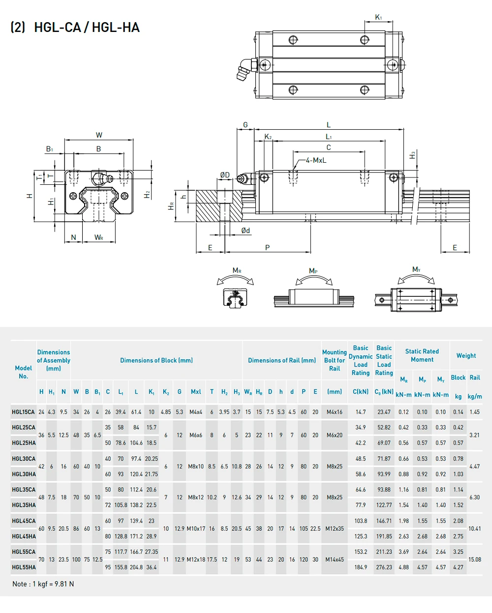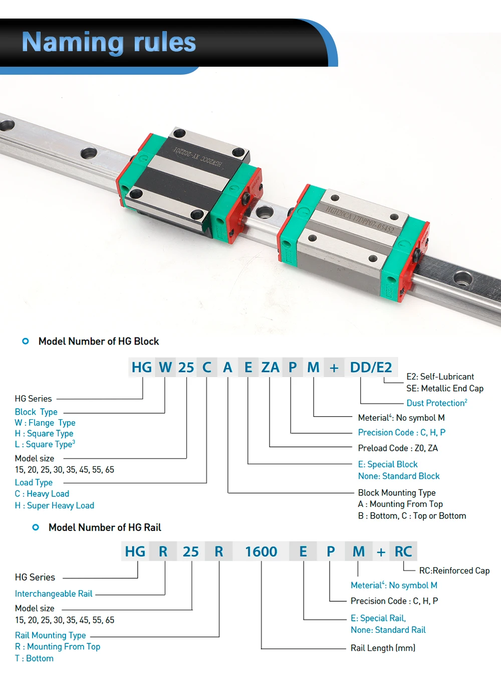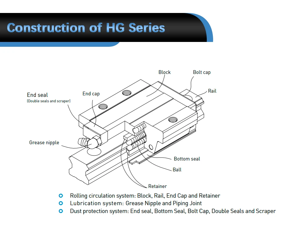 HG series linear guides are four-row single arc-shaped contact linear guides. At the same time, the heavy-duty precision linear guides with optimized structural design are integrated, which improves the load and rigidity compared with other linear guides. It has four-direction load characteristics. And the function of self-aligning can absorb the assembly error of the mounting surface and obtain high precision requirements. The concept of high speed, high load, high rigidity and high precision has become the trend of industrial products development in the world in the future. HG series linear guides are products developed based on this concept.